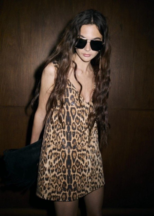 Vestido escote V confeccionado con lentejuelas con estampado animal print exclusivo.