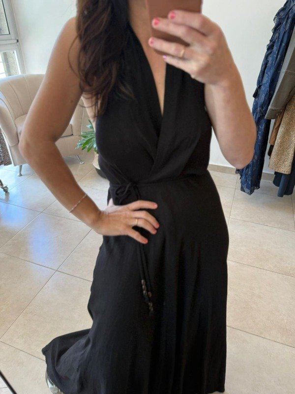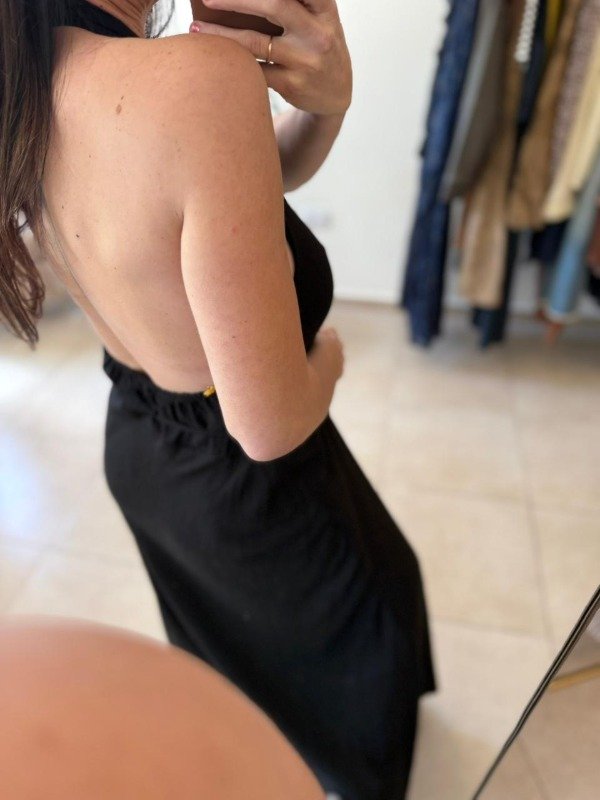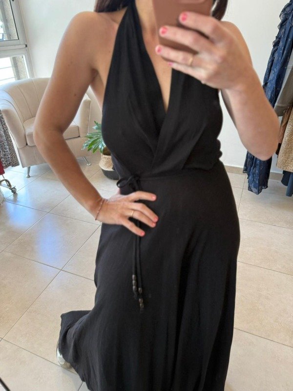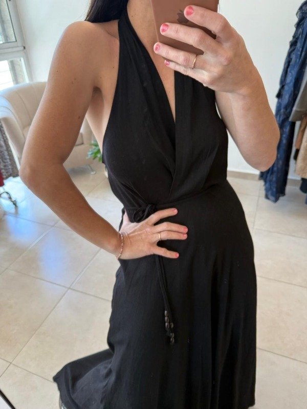 Vestido de escote profundo con espalda abierta y lazo delantero. Forrado.