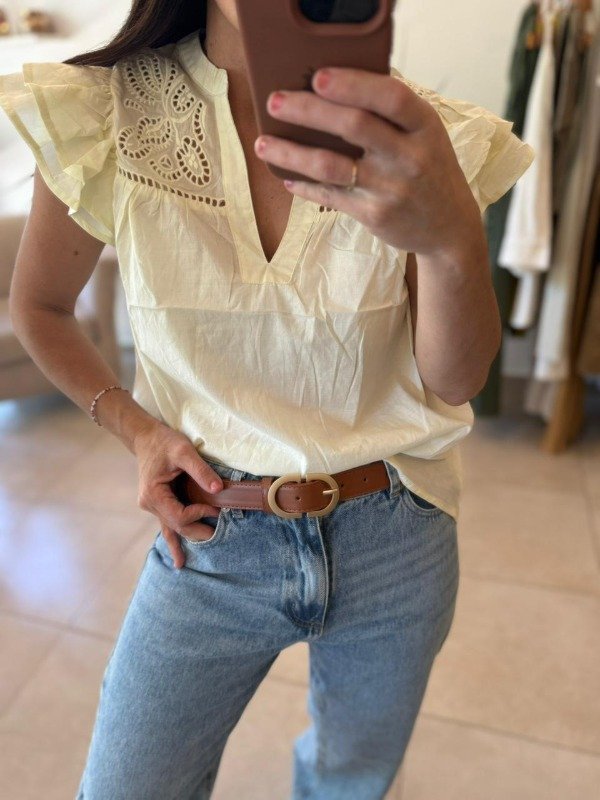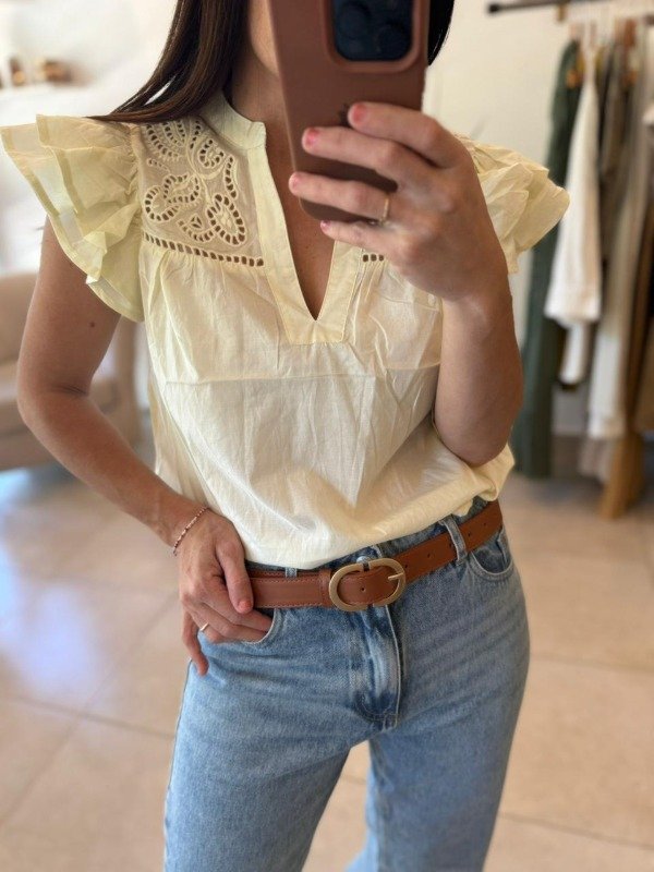 Blusa con volados y broderie en hombro.
