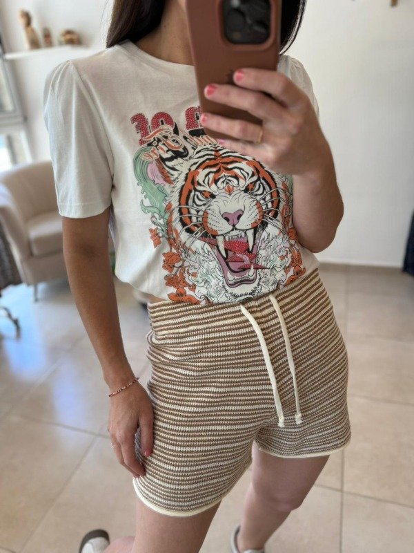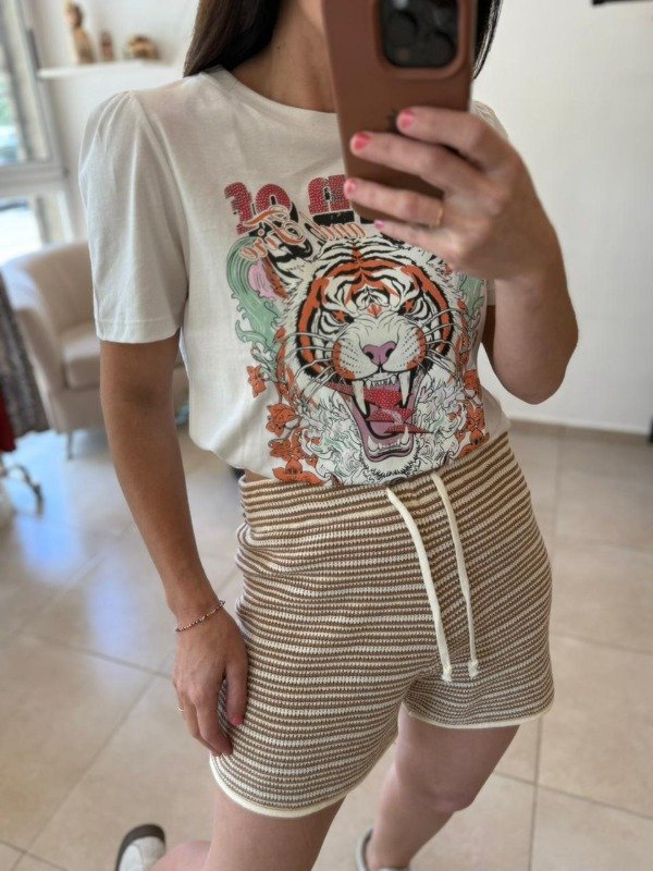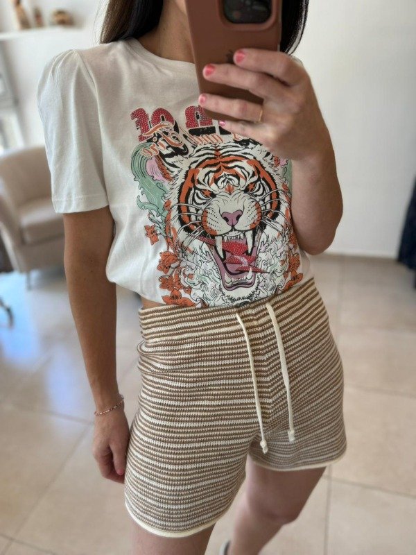 Remera estampada, de escote redondo clásico, en las mangas tiene un pequeño frunce y en el centro de la espalda lleva una grifa con identificación de marca.