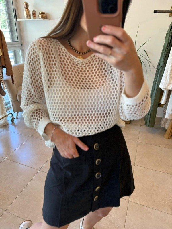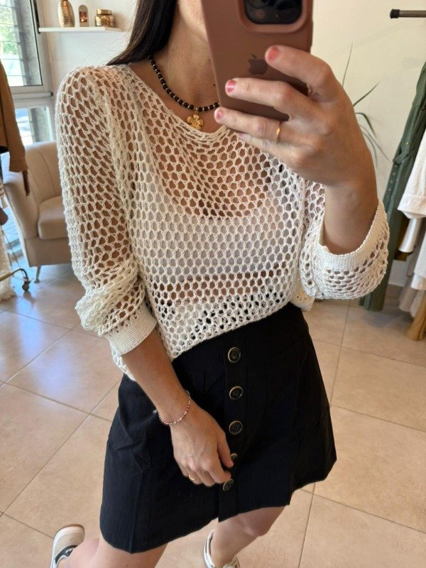 Sweater calado de escote redondo . Cuenta con elástico en sus terminaciones.