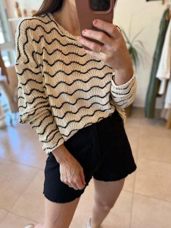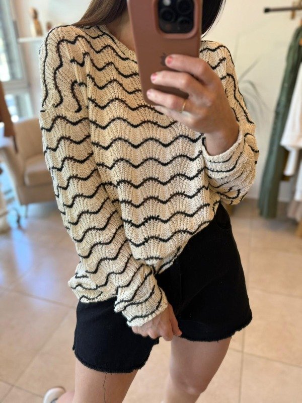 Sweater calado de escote redondo estampado. Cuenta con elástico en sus terminaciones.