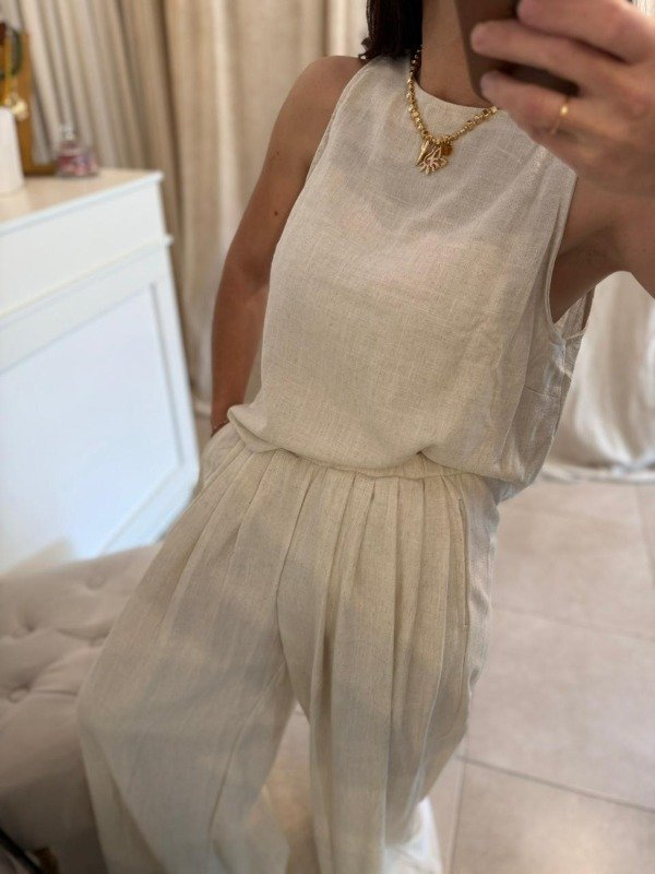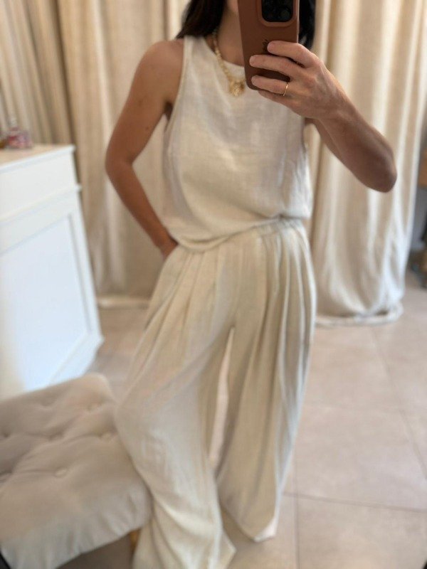 Set de dos piezas: blusa de lino escote redondo y pantalon con elástico en cintura, bolsillos laterales y pinza.
