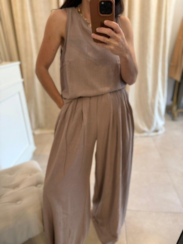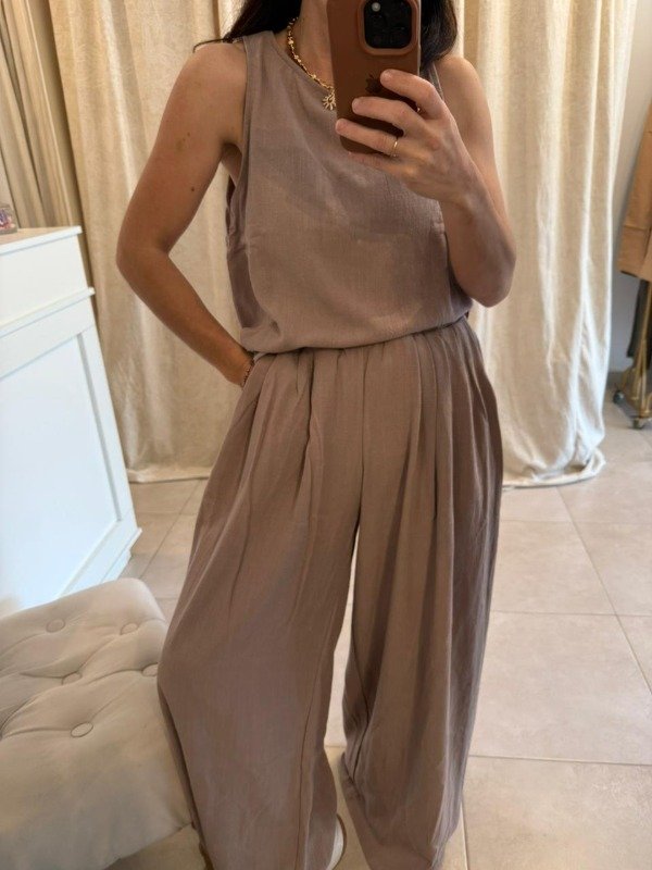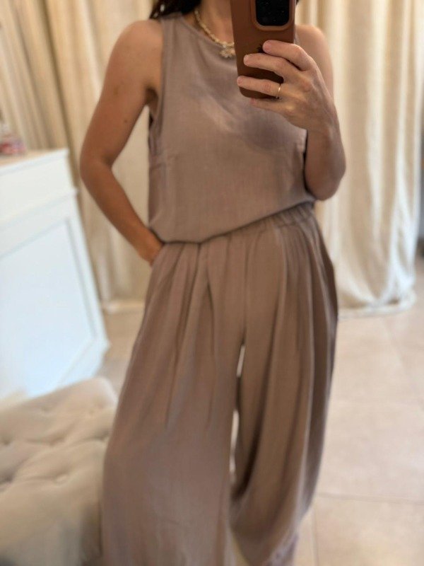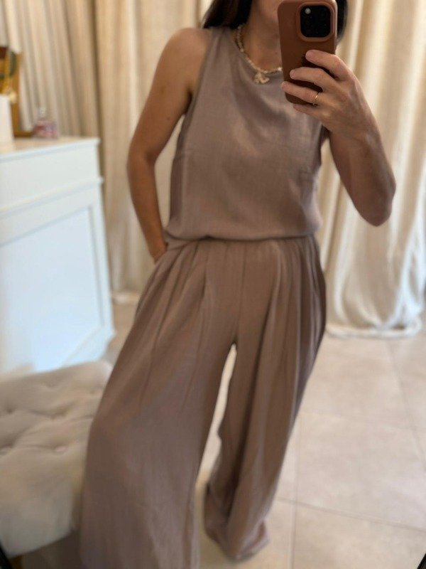 Set de dos piezas: blusa de lino escote redondo y pantalon con elástico en cintura, bolsillos laterales y pinza.