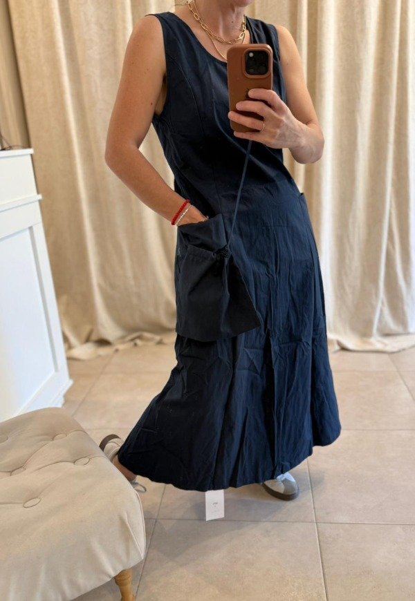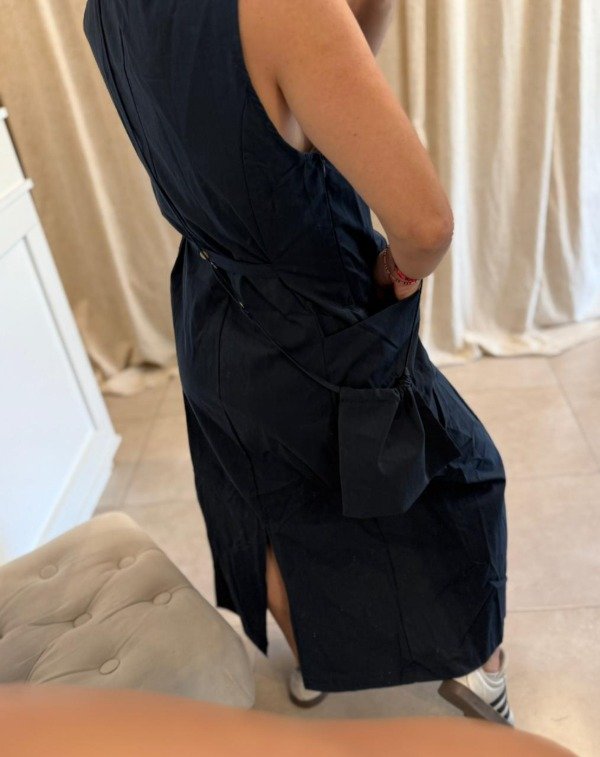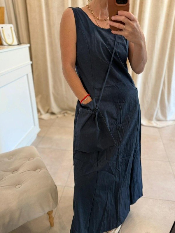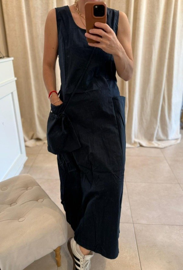 Vestido importado en color maíz. Cuenta con bolsillos delanteros y con una bandolera.