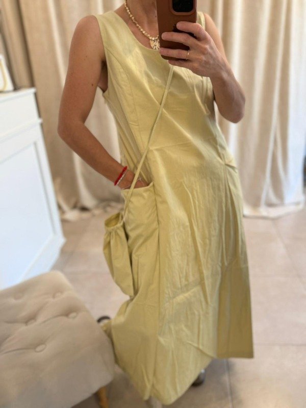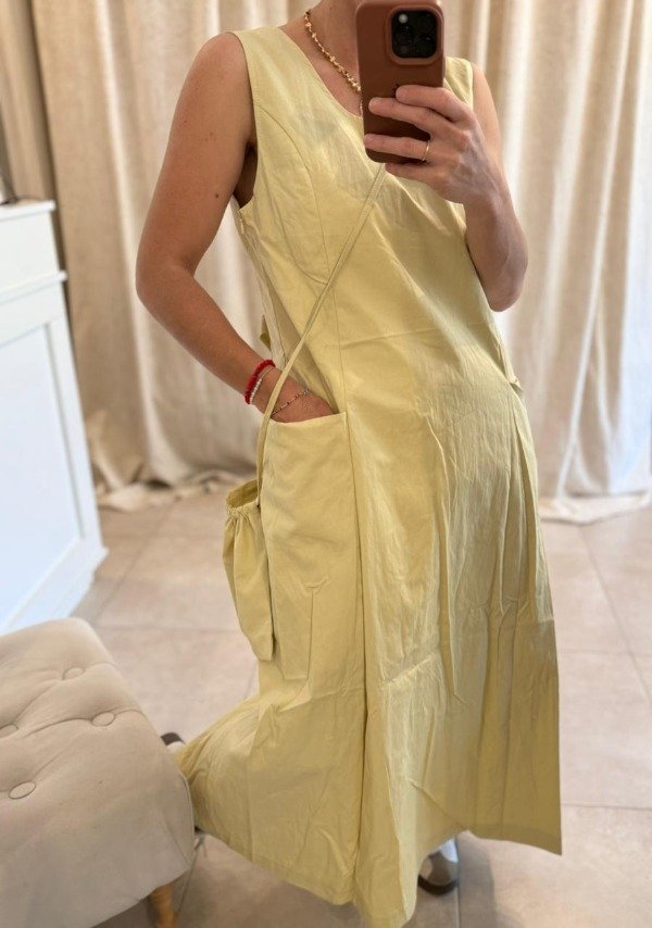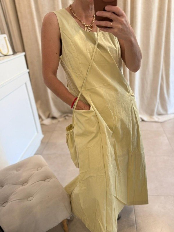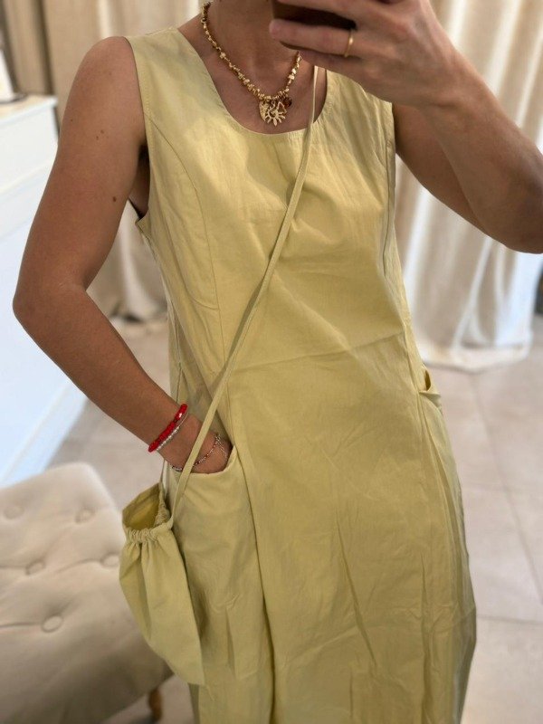 Vestido importado en color maíz. Cuenta con bolsillos delanteros y con una bandolera.