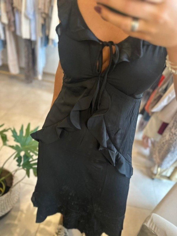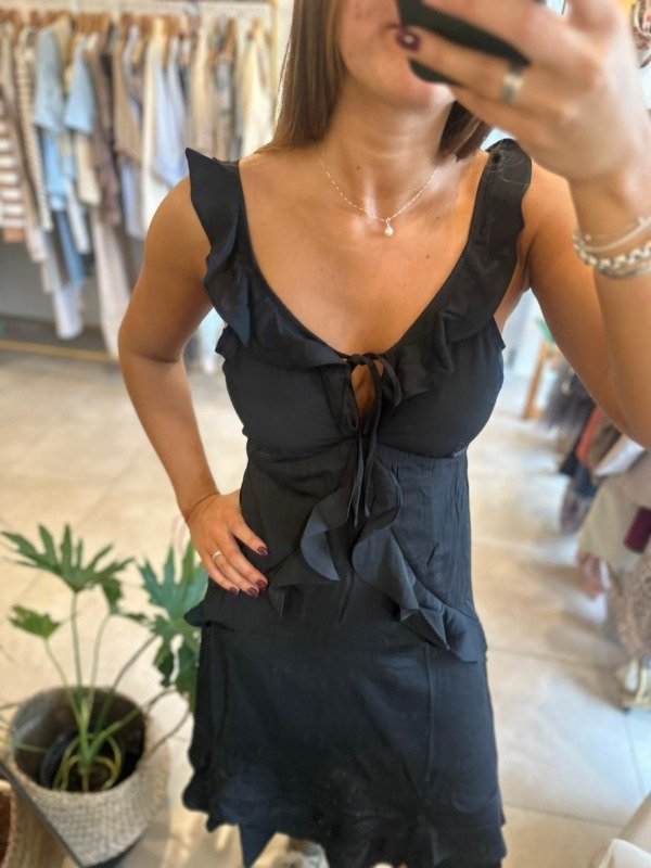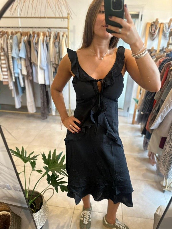 Vestido forrado con vuelo y volados en manga y abdomen. De largo midi.