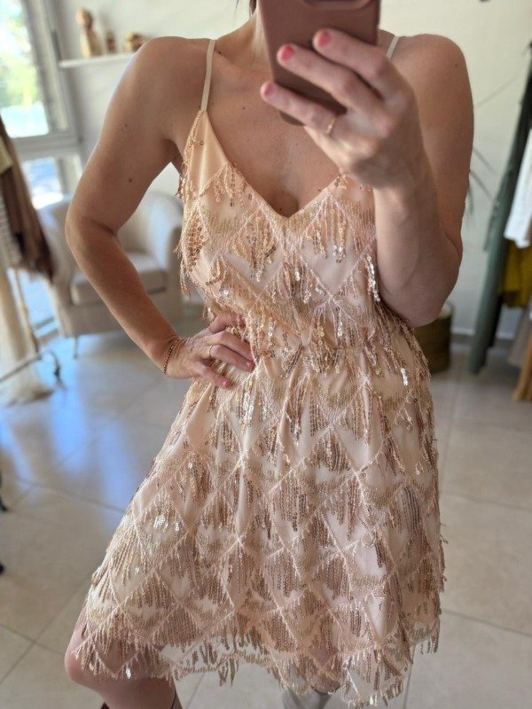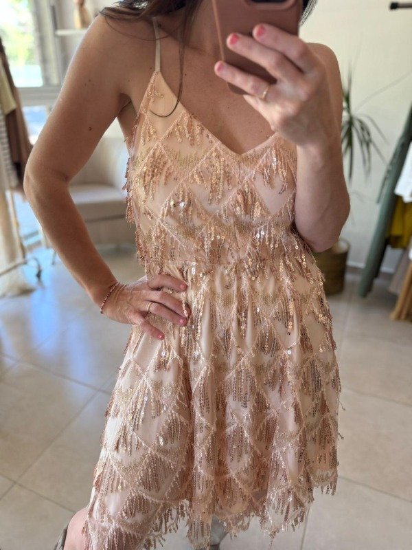 Vestido escote V de lentejuelas con bretel regulable y elástico en cintura. Forrado.