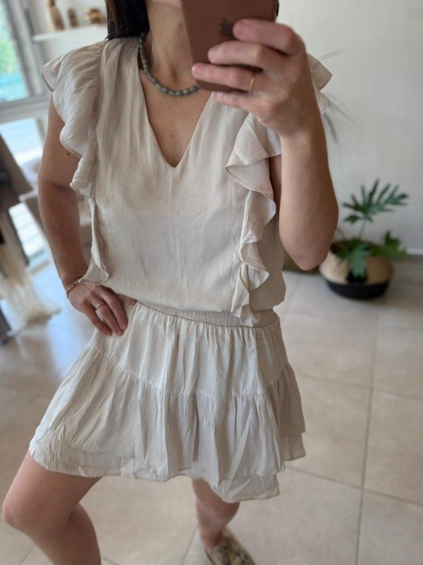 Vestido escote V de volados con elástico en cintura y doble capa de vuelo en falda.