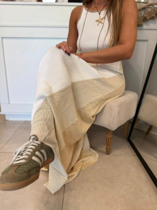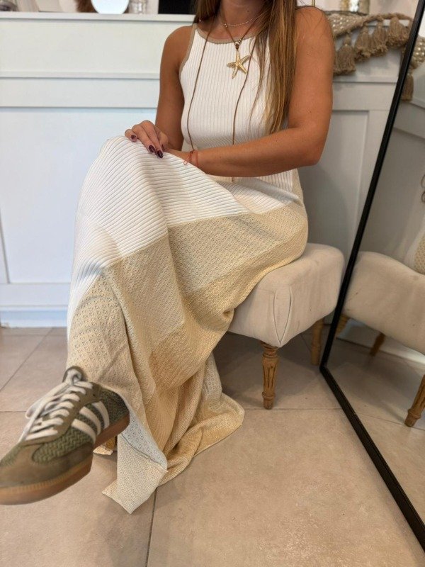 Vestido de punto de corte americano, con combinación de texturas y puntos. Con terminación evace.