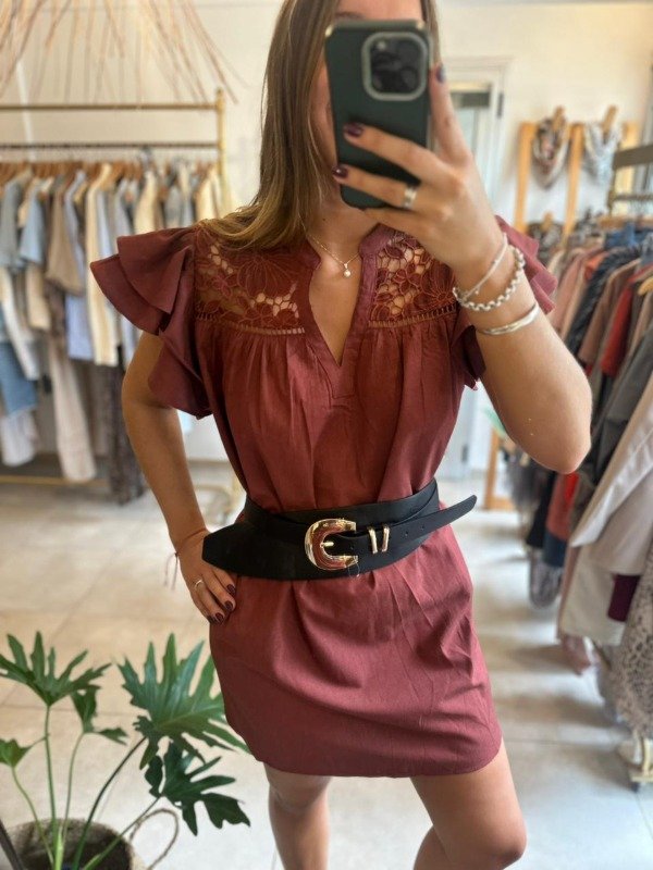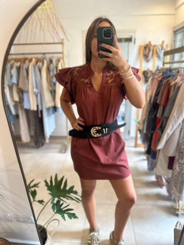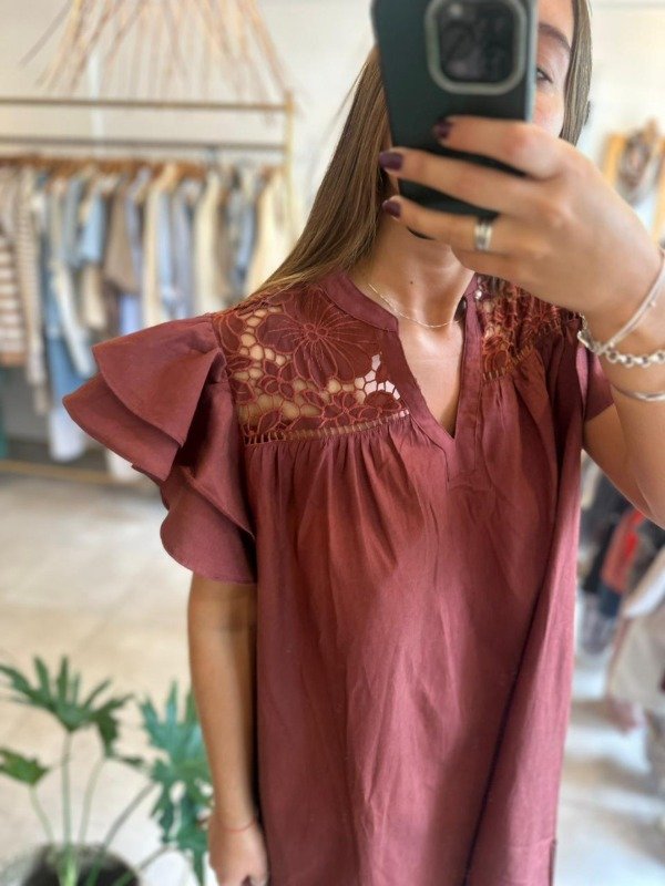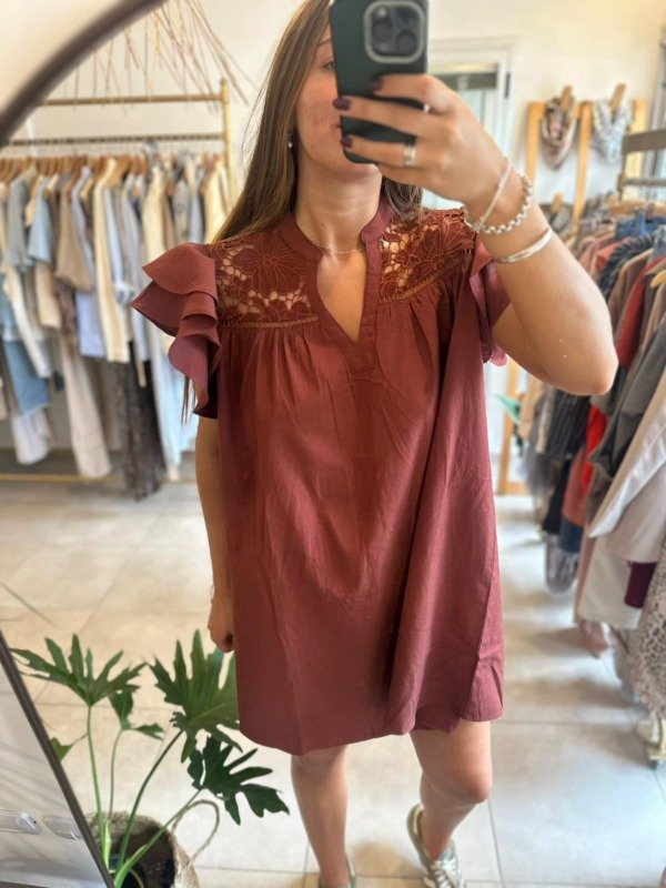 Vestido de manga corta con volados y bordado. Escote en V