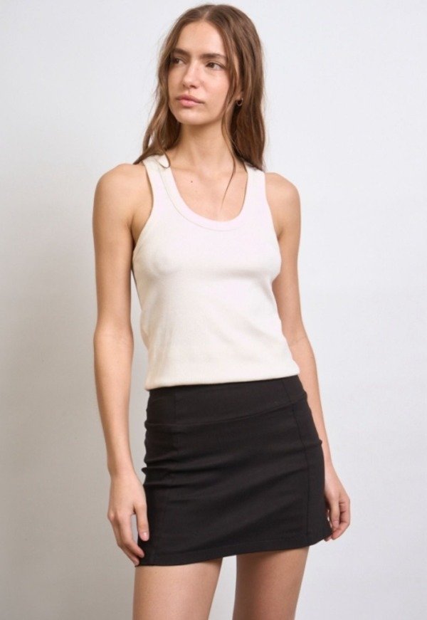 Short pollera mini de bengalina, lleva dos recortes en el delantero y el trasero. A modo de detalle en la cintura se le colocó una chapita metálica con la identificación de marca.
