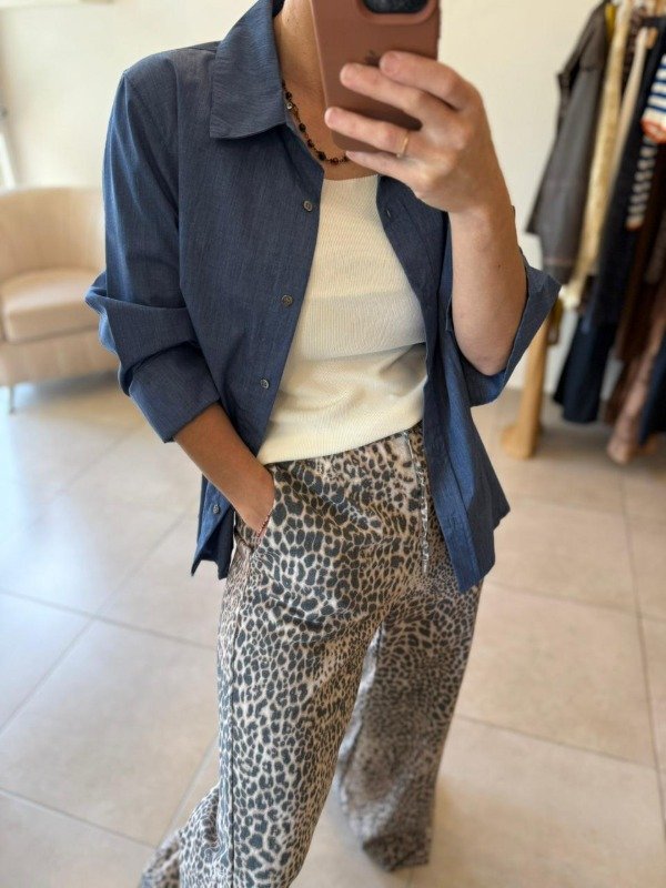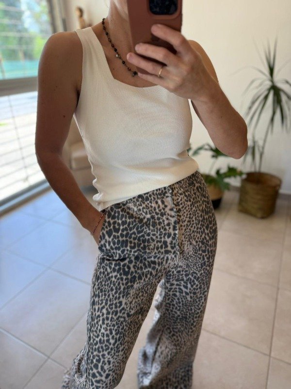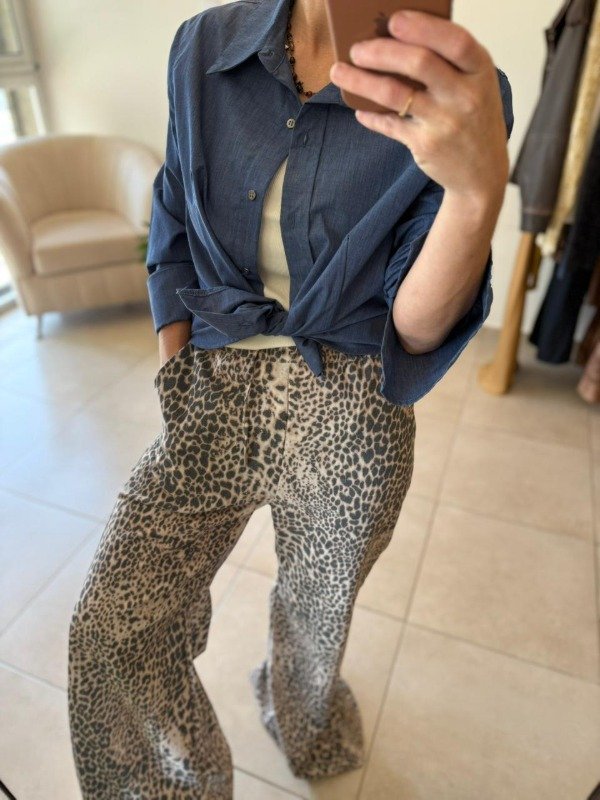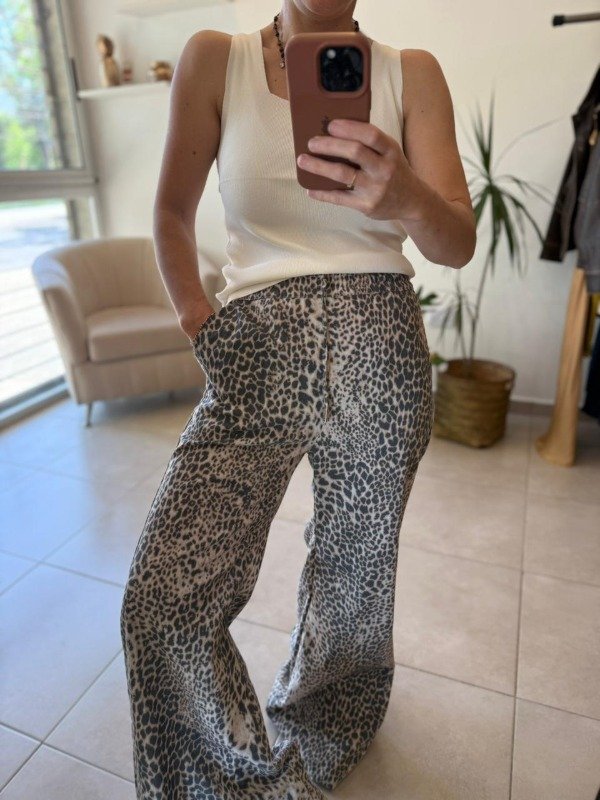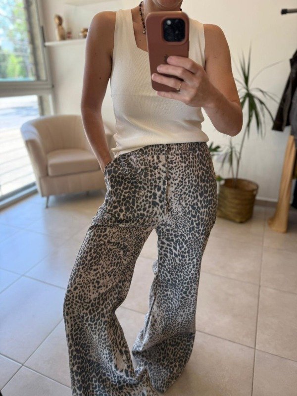 Pantalon leopardo de lino rayon con cintura elastizada y cordon. Bolsillos delanteros. Pierna flare. [55% lino-45% rayon]