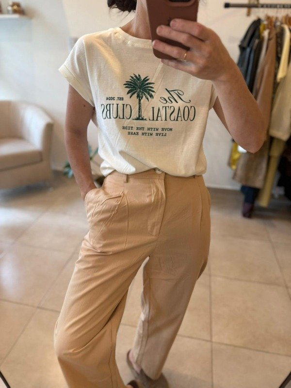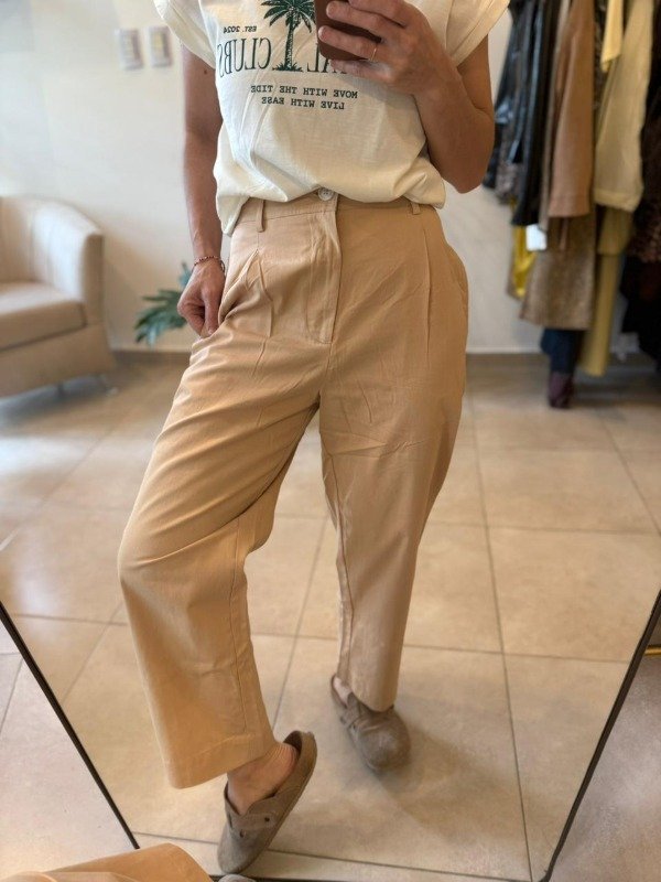 Pantalón sastrero de corte mom, con elástico trasero y cierre delantero. Bolsillos laterales.