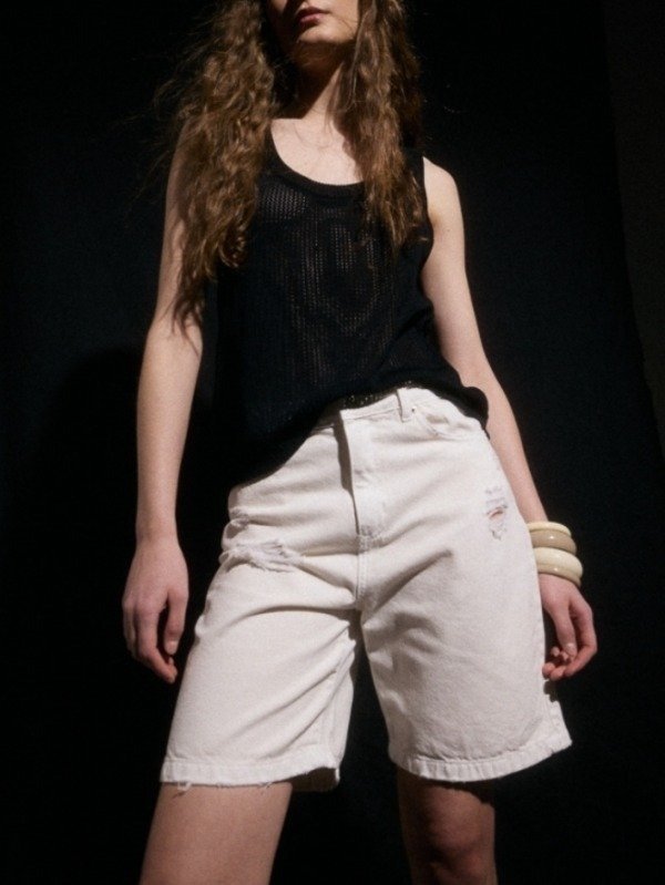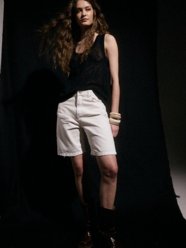 Bermuda de tiro medio, posee un calce relajado, posee roturas en el delantero y cinco bolsillos los cuales están atracados con snaps metálicos