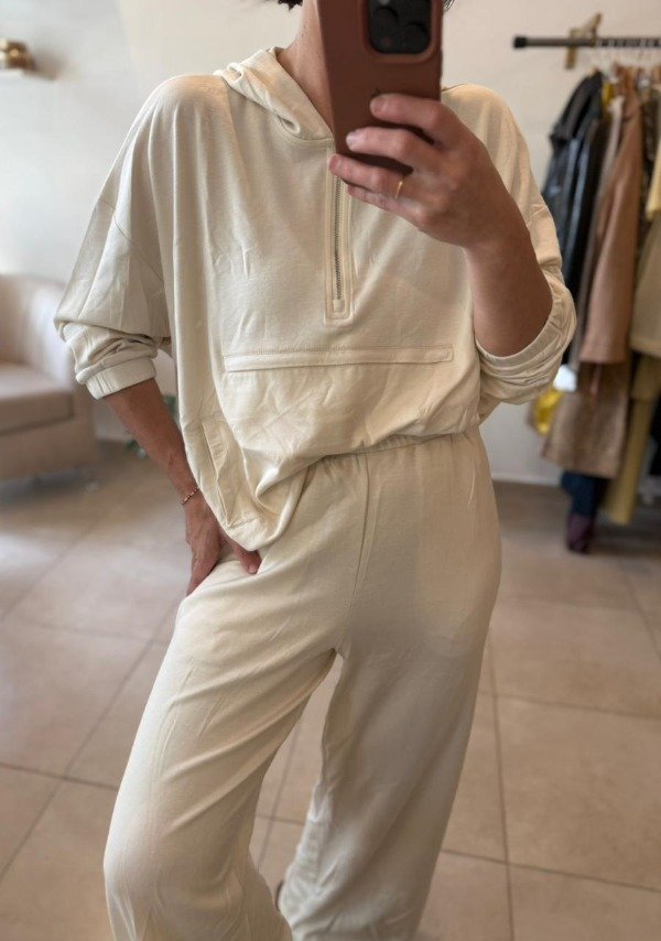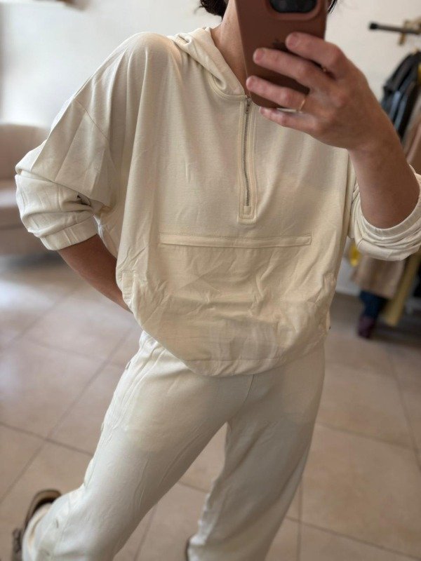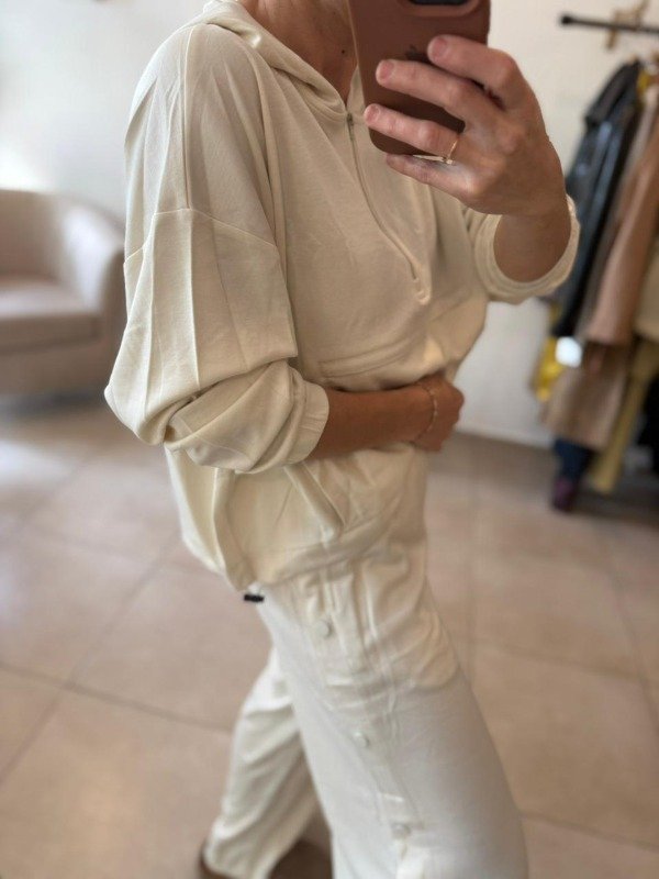 Buzo de medio cierre con capucha y bolsillos en abdomen. De corte oversize con sujetadores laterales.