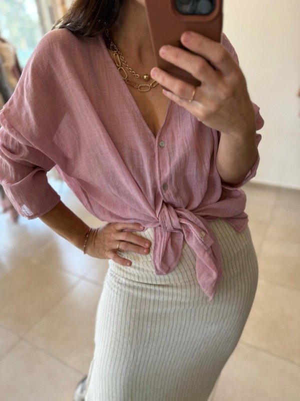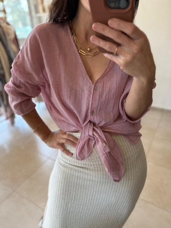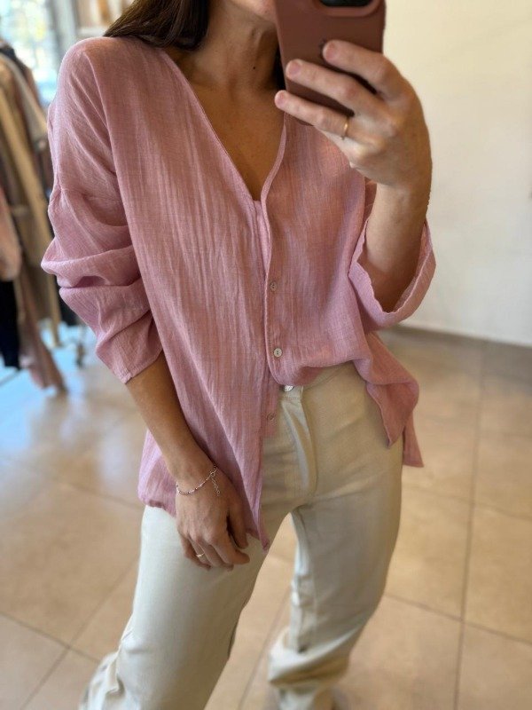 Blusa escote en V abotondad de mangas 7 octavos, estilo oversized. De telita ligera.