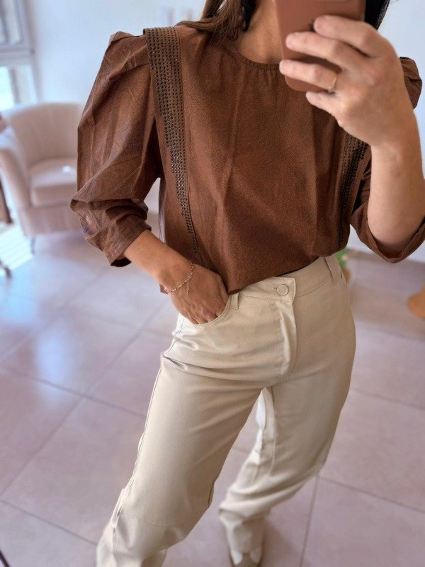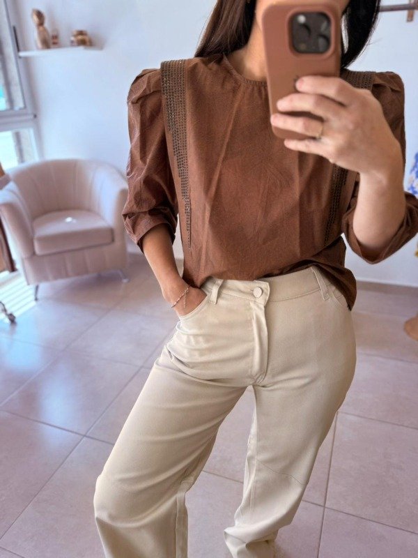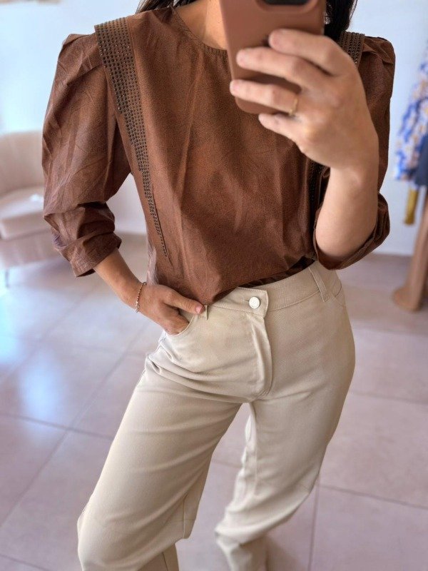 Blusa con escote a la base, detalle de tabla con tachas y manga al codo con volumen.
