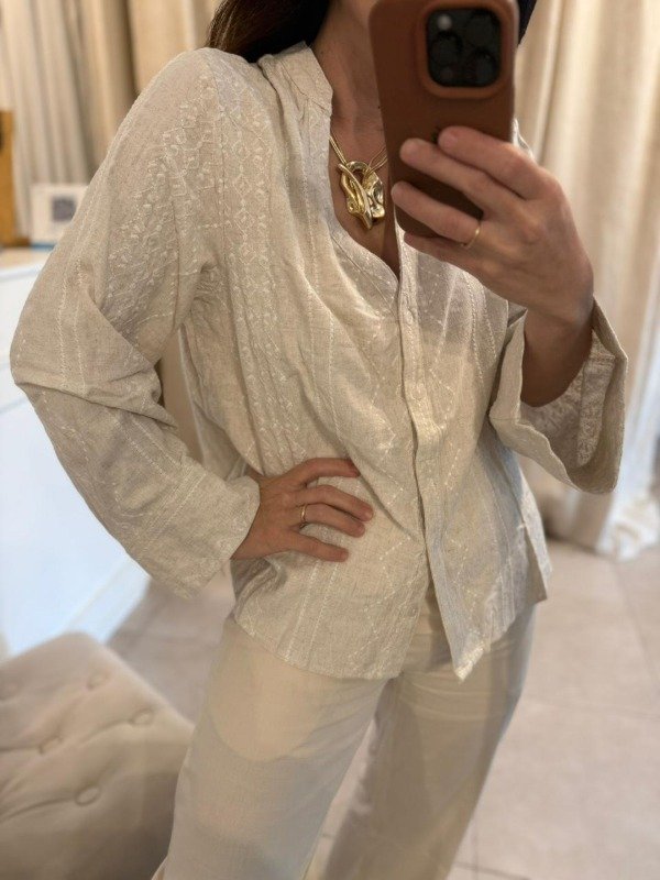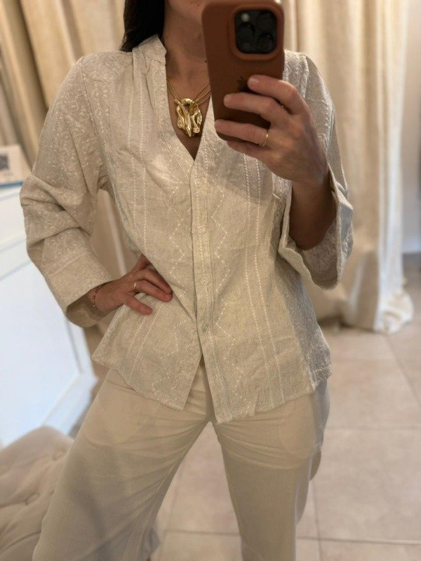 Camisola de lino bordada de cuello mao y doblez en manga.