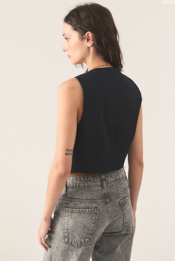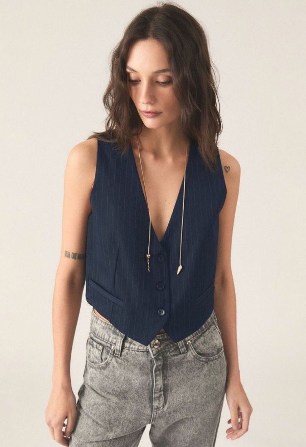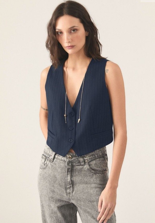 Chaleco De Gabardina Tizada. Este ítem Cuenta Con Acceso Por Medio De Botones En Cartera Central Y Falso Bolsillo Y Pinza En Delantero.