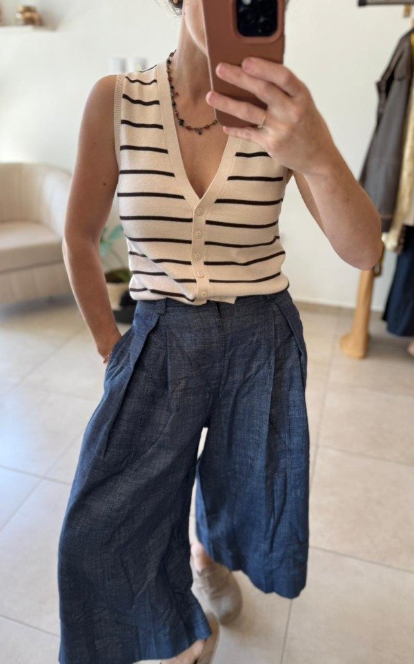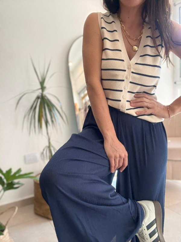 Chaleco tejido a rayas. Calce ajustado de largo hasta debajo de la cintura. Rayado en su totalidad, con terminación de vivos en liso a tono de la base. Botones pequeños en delantero a tono. Esta prenda es importada.