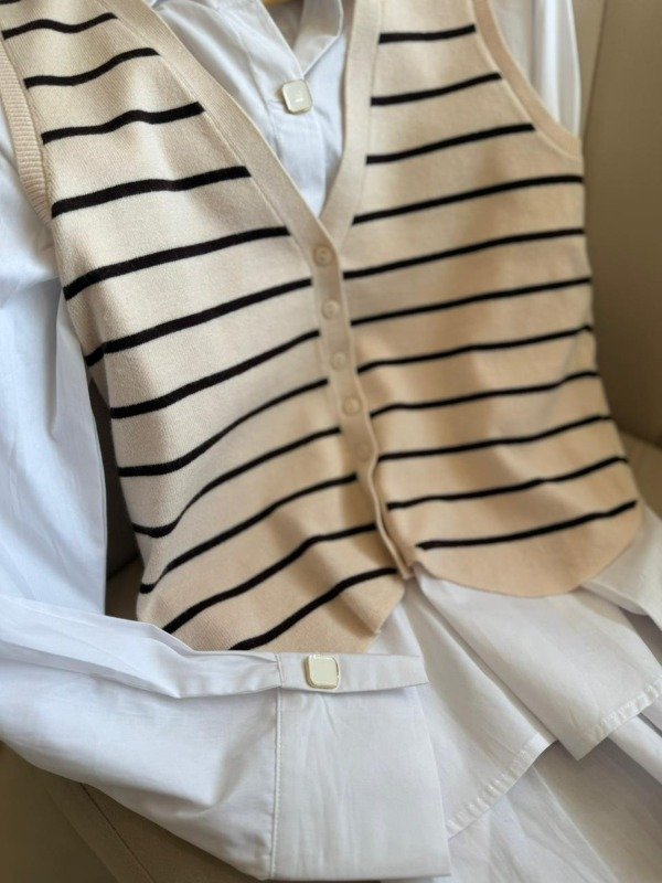 Chaleco tejido a rayas. Calce ajustado de largo hasta debajo de la cintura. Rayado en su totalidad, con terminación de vivos en liso a tono de la base. Botones pequeños en delantero a tono. Esta prenda es importada.