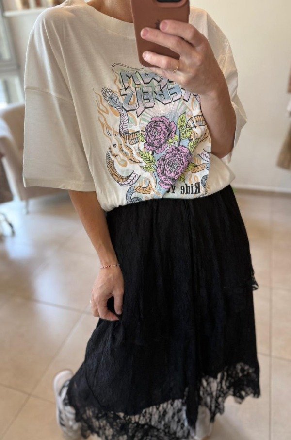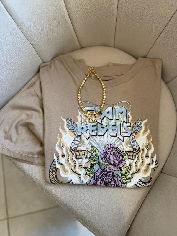 Remera estampada de manga corta, su calce es amplio, posee un escote redondo clásico y su escote está terminado con ribb a tono
