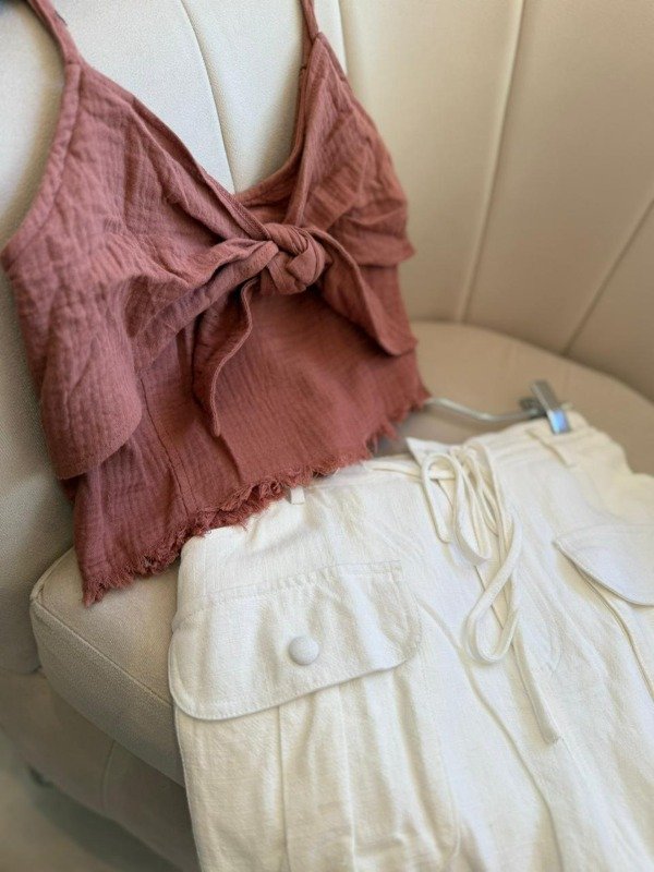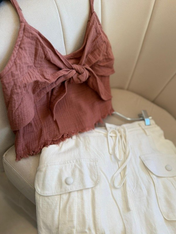 Top con nudo delantero de breteles regulables y elástico en cintura .